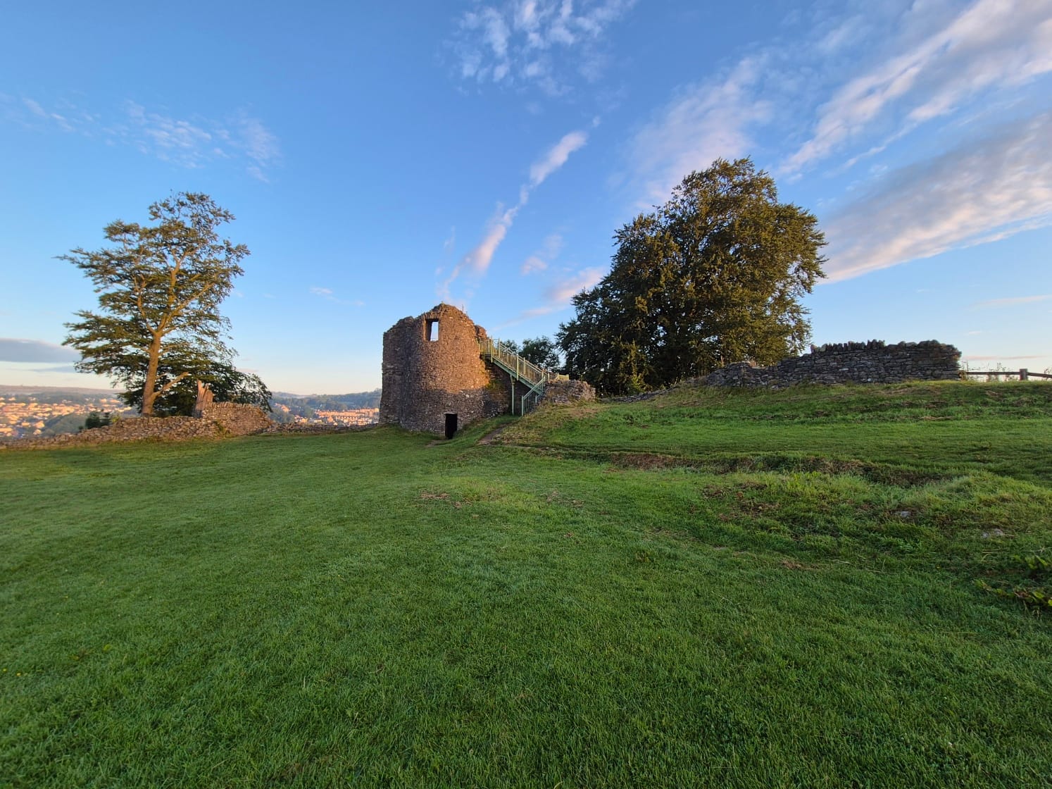 There is one tower remaining at the site where you can see what was likely a storage room underneath, then follow the spiral stairs up to an accommodation area with fireplace and a wonderful view. The current metal stairs are not where the original set was. There are some slight remains you can see from the room upstairs where you can also see the old garderrobe.
